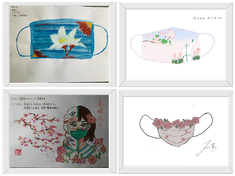 此次活动共评选出优秀作品21份,选手们通过手绘、电子绘图等形式展示自己的奇思妙想。其中,中师203王家欢的作品《春暖花开》以手绘形式向逆行者致敬,以春日繁花的灿烂憧憬未来的多彩;中师211成佳焱的作品《花开疫散,春风依旧》通过电子绘图将校园内常见的海棠花和郁金香以及为我们负重前行的“大白”加入口罩设计中,展现校园的勃勃生机,寄托对“大白”们的感激以及对抗疫必胜的信念;中师定向211石潇的作品《笑靥如花》紧扣温暖主题,用微笑面对困难,希望每一个通大人都可以笑靥如花;汉语国际201王珂的作品《你好》则表达了口罩虽隔离病毒,但不隔离爱的祝愿。