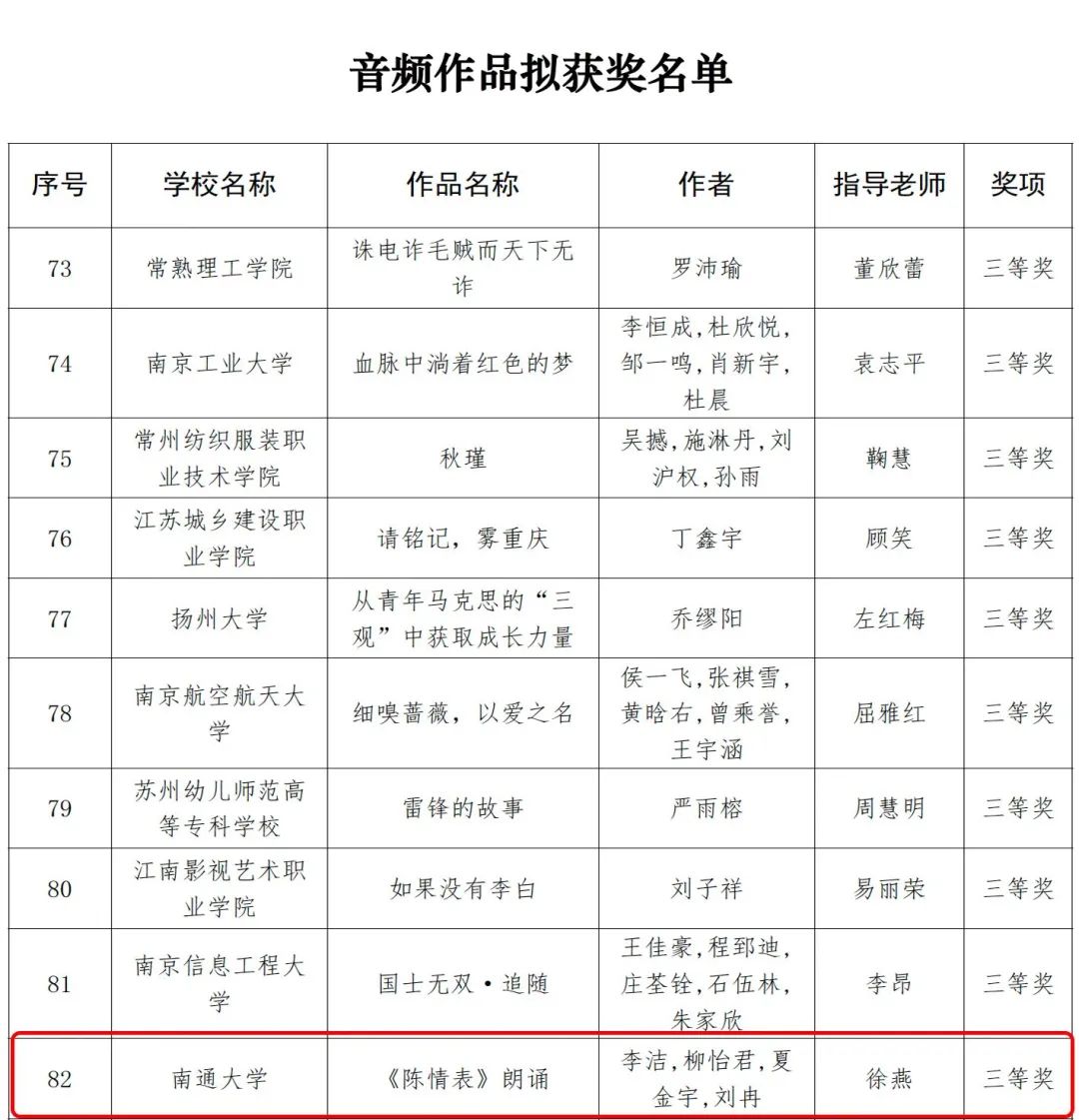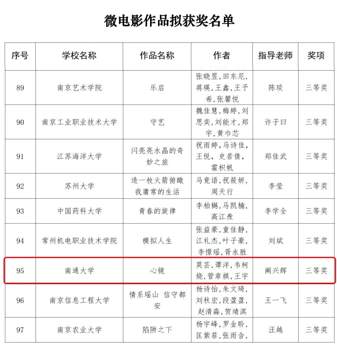 近日,江苏省委教育工委、江苏省教育厅公布了2023年江苏省大学生网络文化节和高校网络教育优秀作品推选展示活动遴选结果。经过高校申报、材料初审、专家评审,海星tv apk 共三项作品在江苏省大学生网络文化节中取得佳绩,微视频作品《中国人物—雷锋》荣获微视频类三等奖,微电影作品《心镜》荣获微电影类三等奖,音频作品《陈情表》荣获音频作品类三等奖。